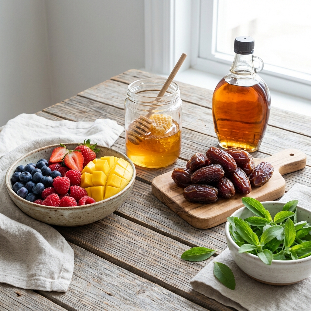 Stevia and monk fruit are zero-calorie natural sweeteners. They do not raise blood sugar at all. Great options if you are specifically trying to reduce sugar intake while still enjoying sweet tastes.
