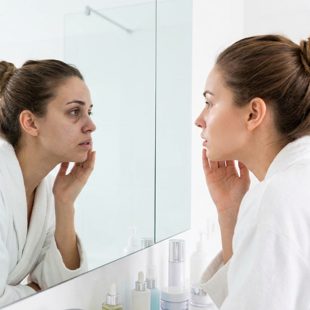 Dull, grayish complexion. Poor circulation and glycation give skin a tired, lifeless appearance.